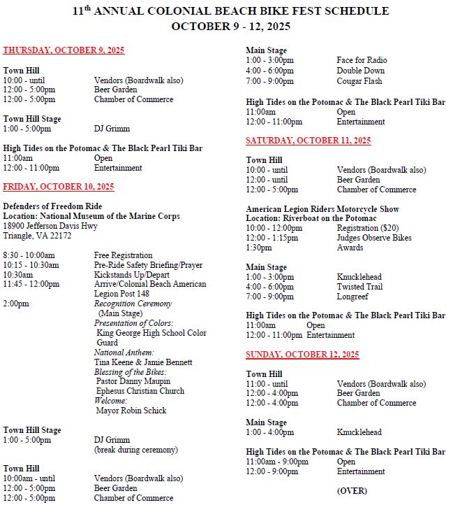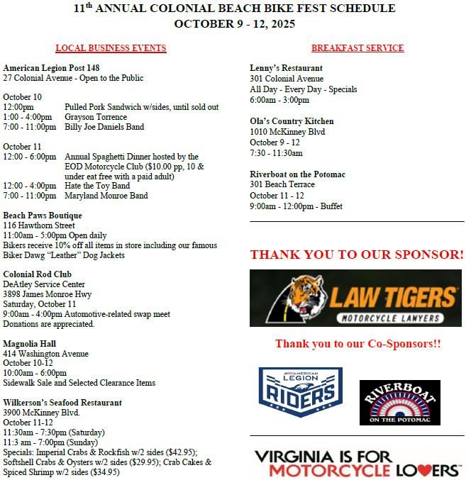 The countdown is on for the 11th Annual Colonial Beach Bike Fest, happening October 9–12, 2025! Four epic days of bikes, bands, beaches, and bites await — and now you can plan your weekend down to the last ride. From live music and scenic group rides to contests,…